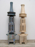 uit losse onderdelen bestaande houten torens, soms bewerkt met papier en pigment, opgebouwd rond een as.